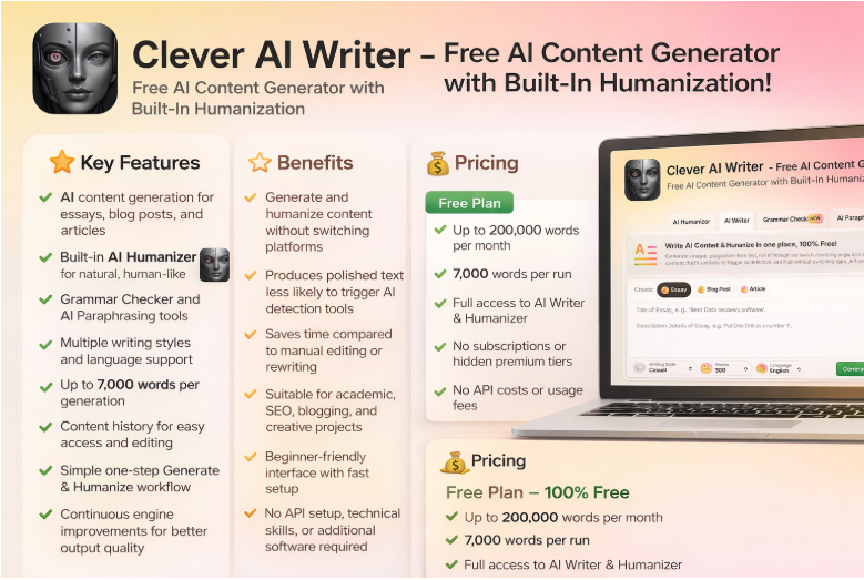 Clever AI Writer is an advanced all-in-one AI writing platform that combines content generation, rewriting, and AI humanization into a single seamless workflow. Designed for bloggers, marketers, students, SEO professionals, and businesses, the platform removes the need for multiple writing or editing tools by allowing users to create and refine human-quality content in one place.