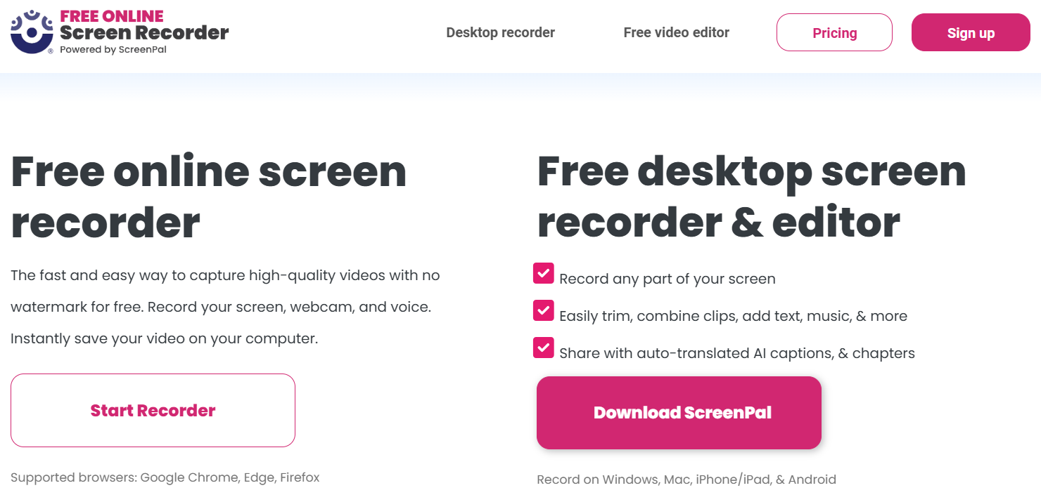- Browser-based recording — Record directly from your browser with no downloads or plugins required.