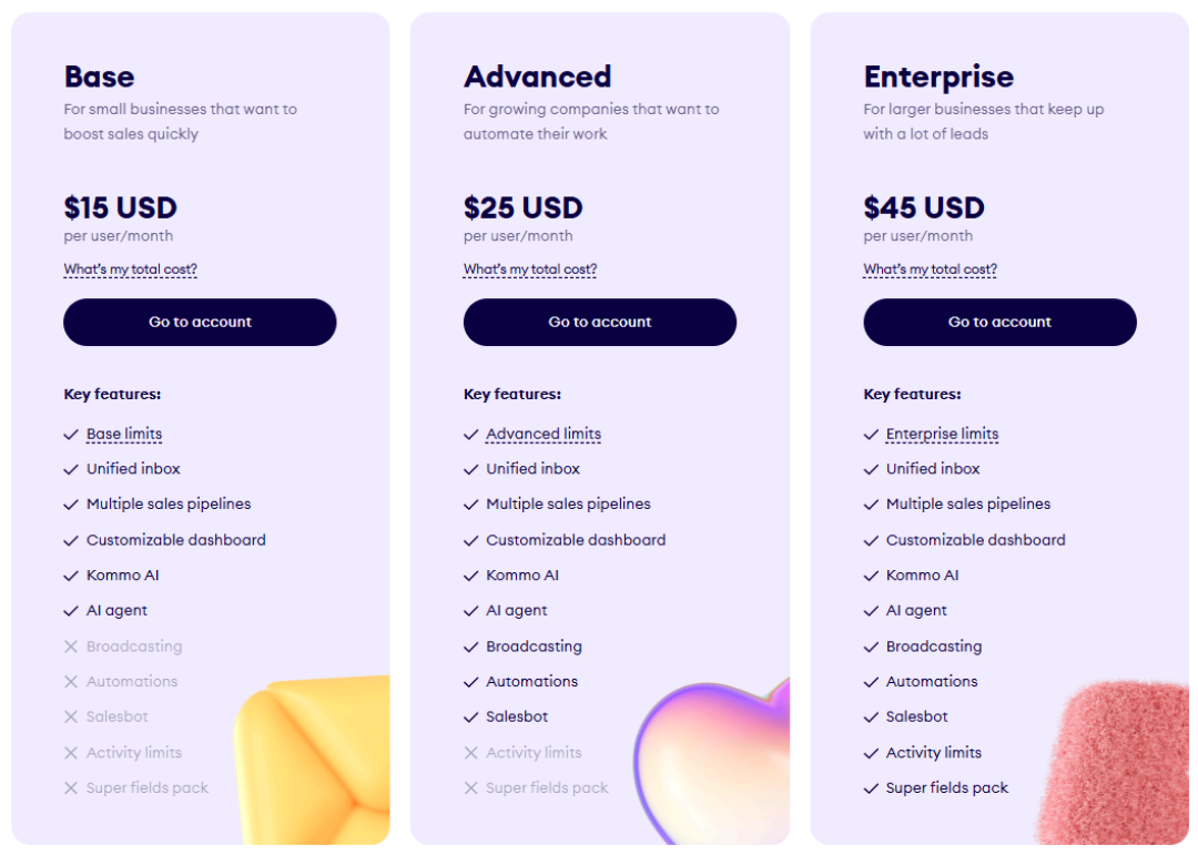 Designed for small businesses wanting to rapidly increase sales, the Base Plan charges $15 USD per user each month and includes capabilities like Kommo AI, an AI agent, broadcasting, automations, a Salesbot, and the super fields bundle, all of which include sales pipelines, a single inbox, and a custom dashboard.