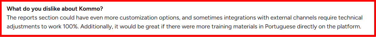 Limited report personalization, integrations that sometimes need technical adjustments, and a scarcity of regional training resources define Kommo’s downsides.