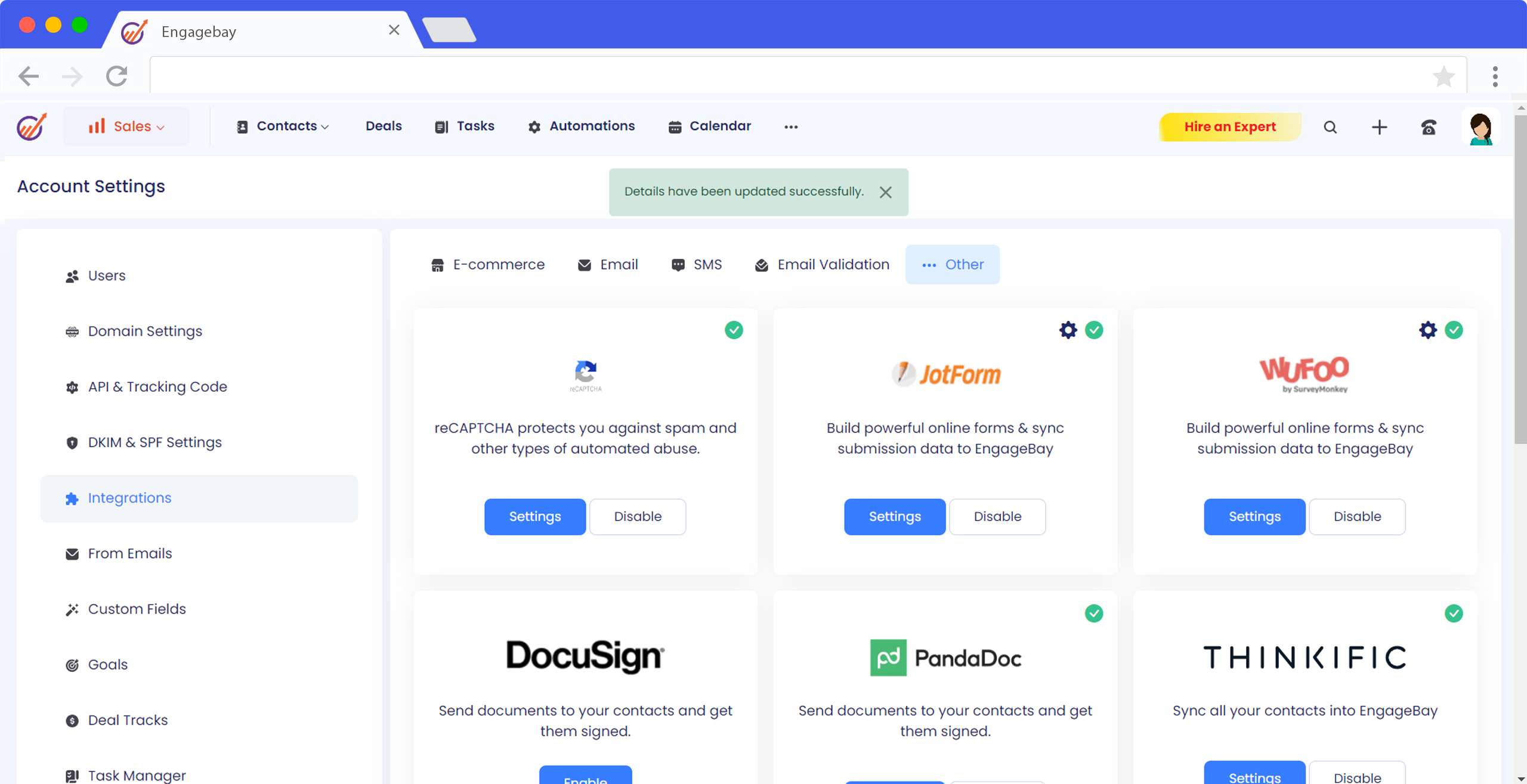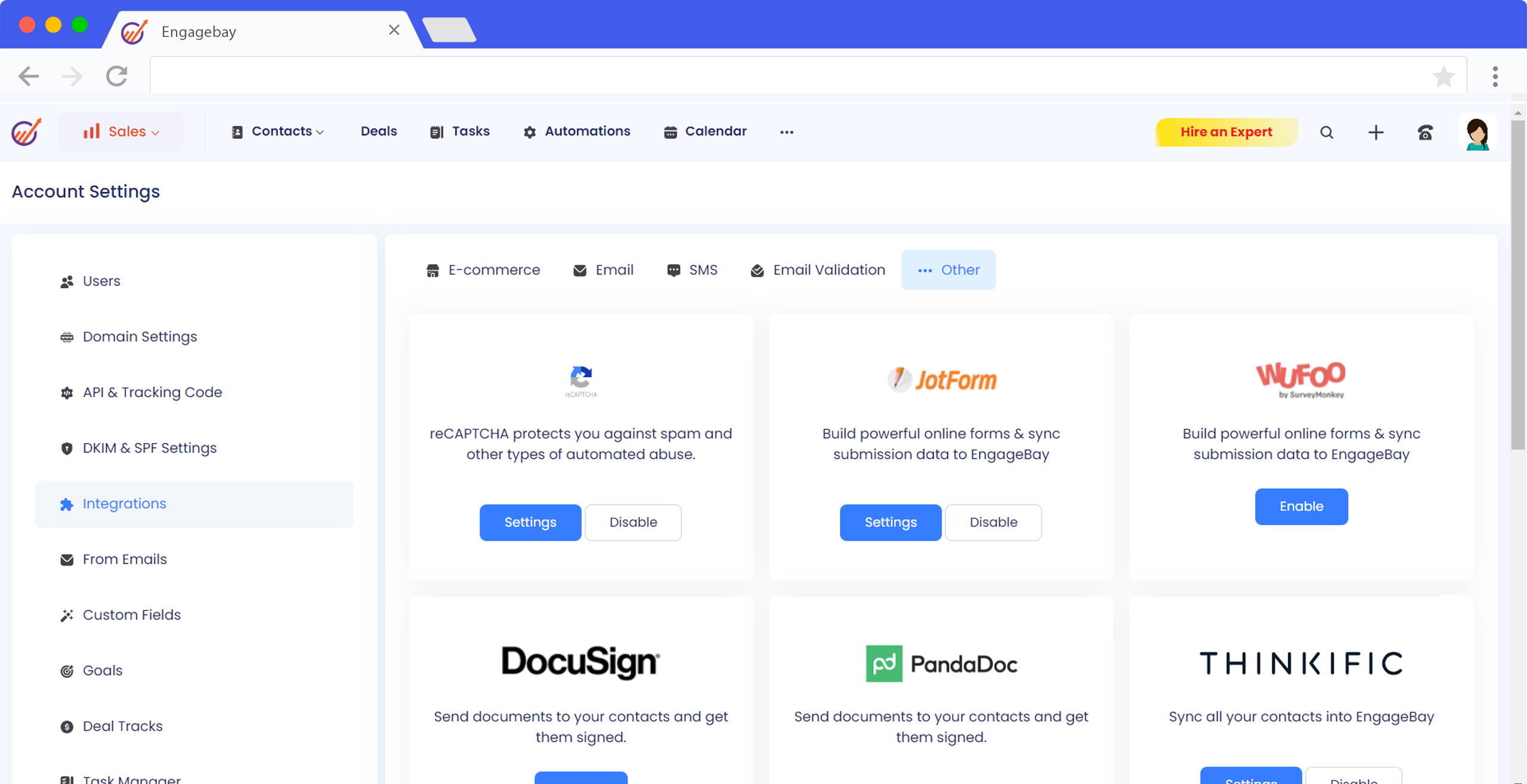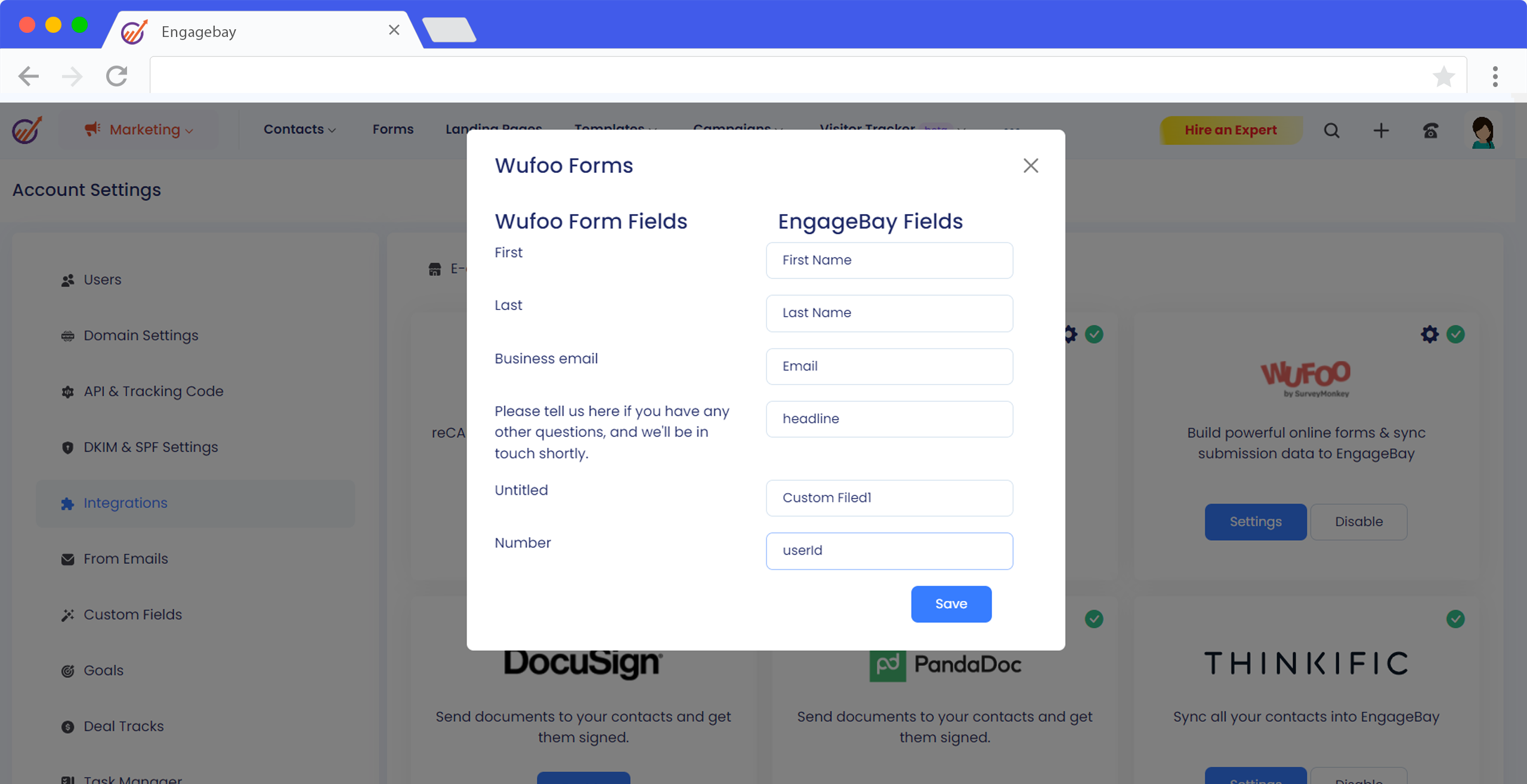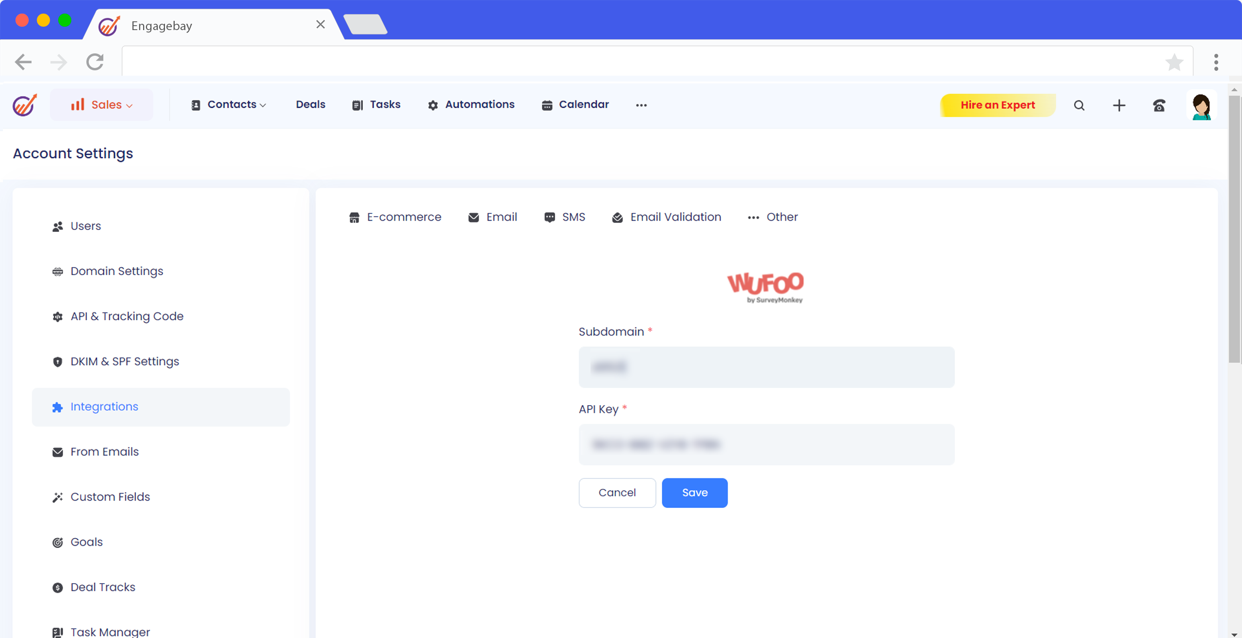 The EngageBay - Wufoo integration empowers anyone to create stunning online forms. The synergy between Wufoo and EngageBay through this integration ensures that data from Wufoo forms is seamlessly transferred into EngageBay, allowing for an automated flow of leads through your sales pipeline bolstered by EngageBay’s comprehensive automation and customer management functionalities.