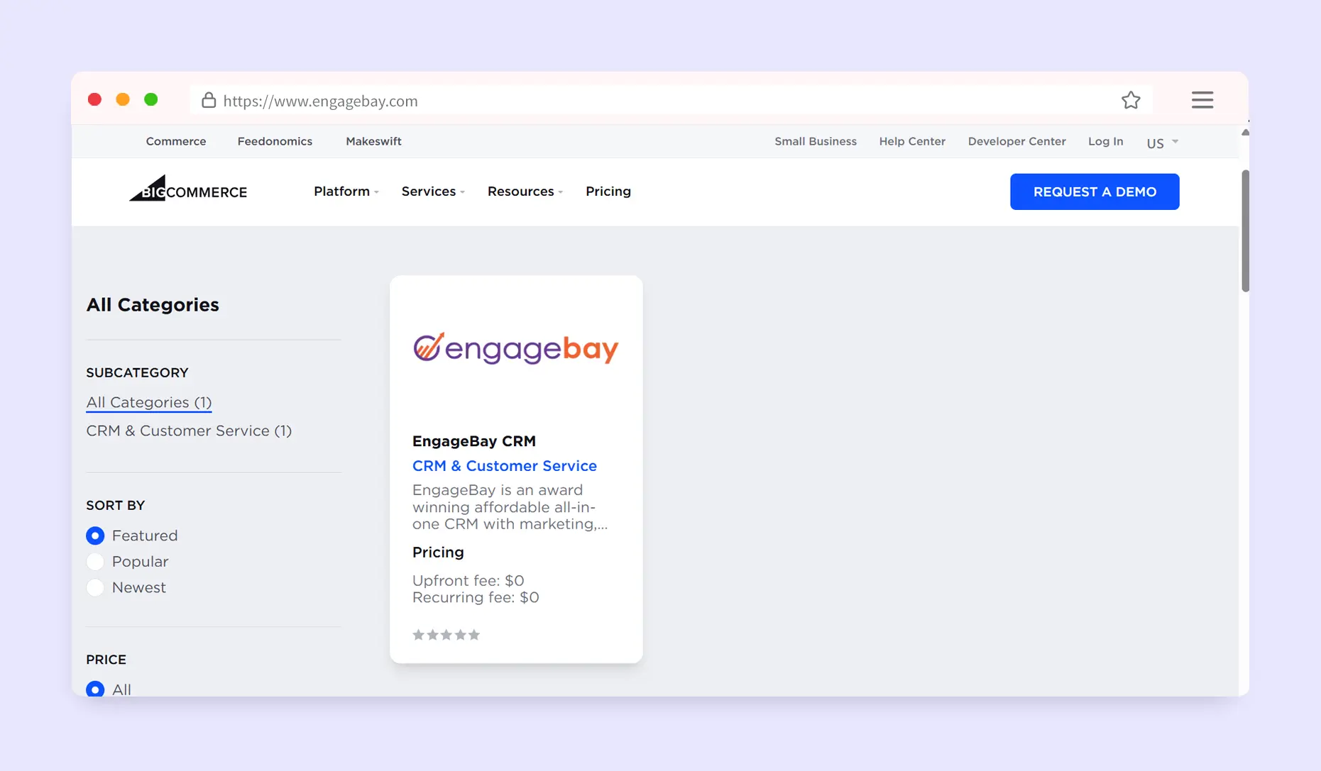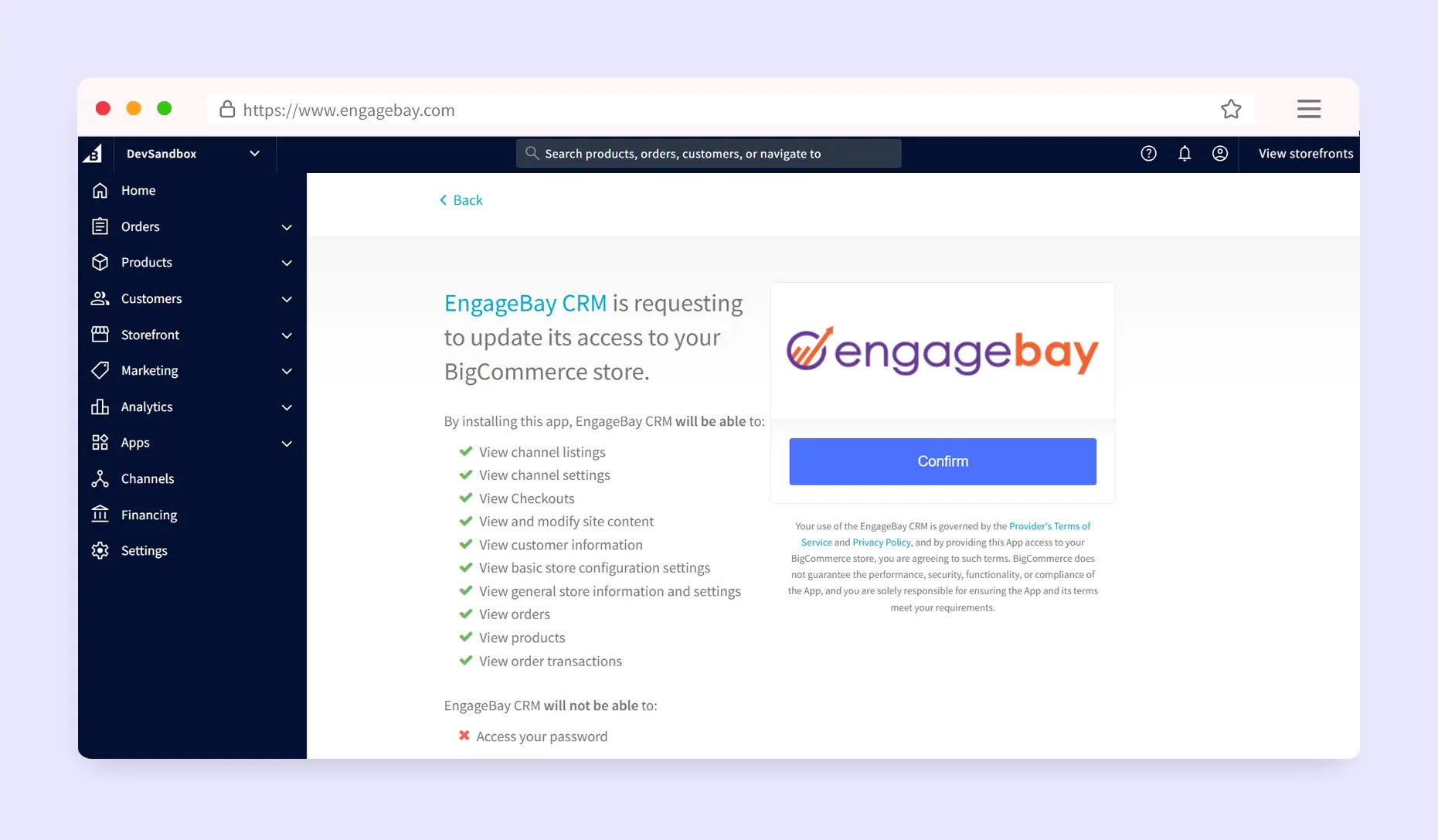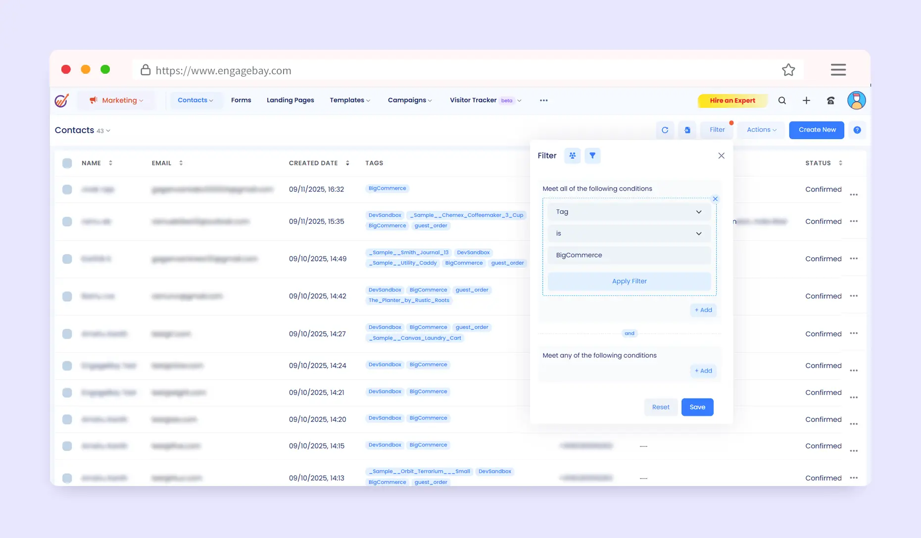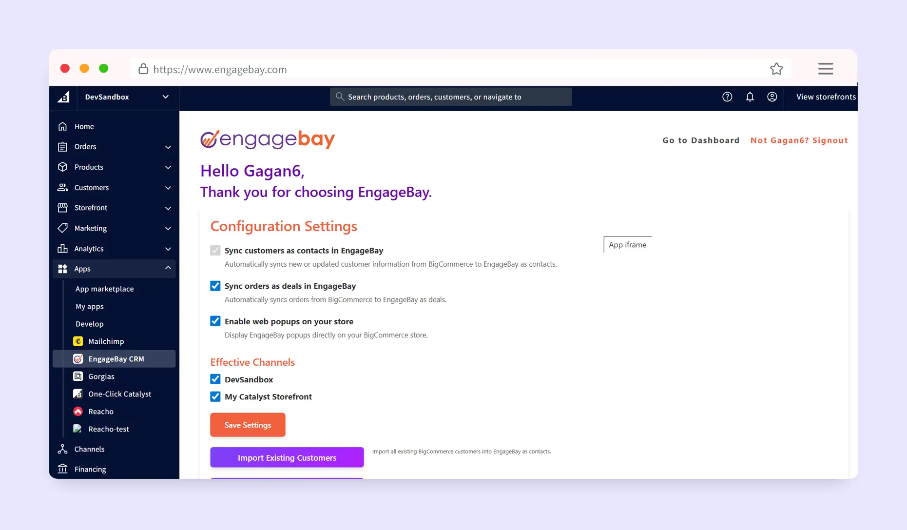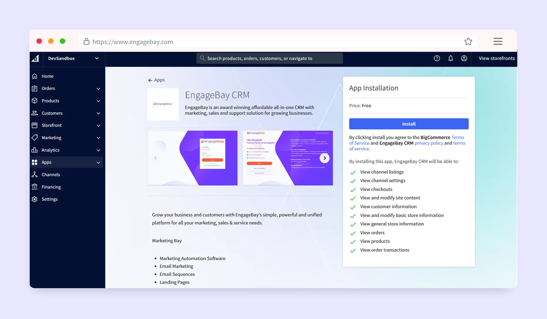 The EngageBay - BigCommerce integration lets you track your users and orders in EngageBay by automatically syncing customer and order data in your EngageBay account. Moreover, segment your customers by lifetime revenue, average order value, products purchased, purchase totals, create personalized and triggered emails, and more.