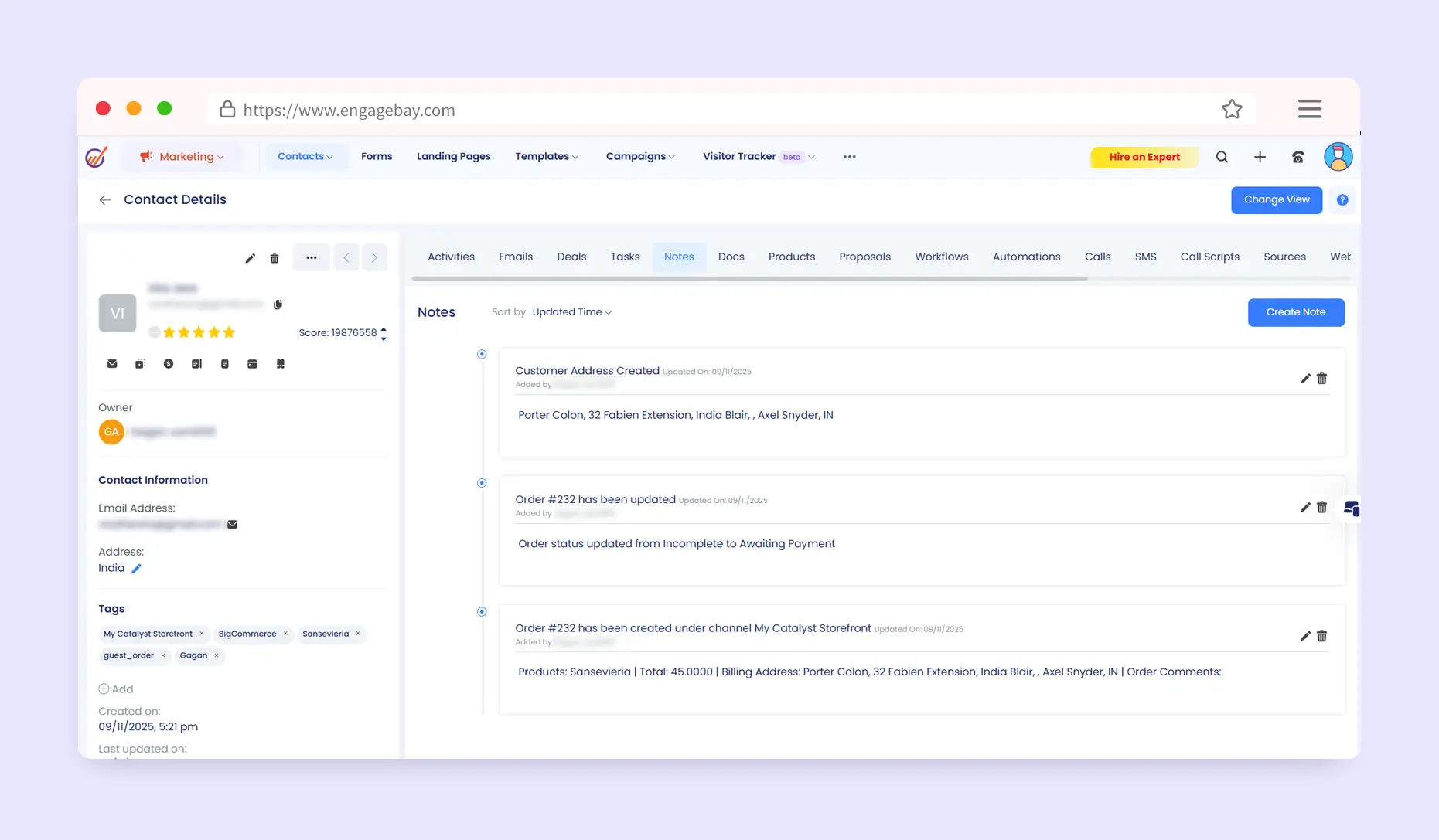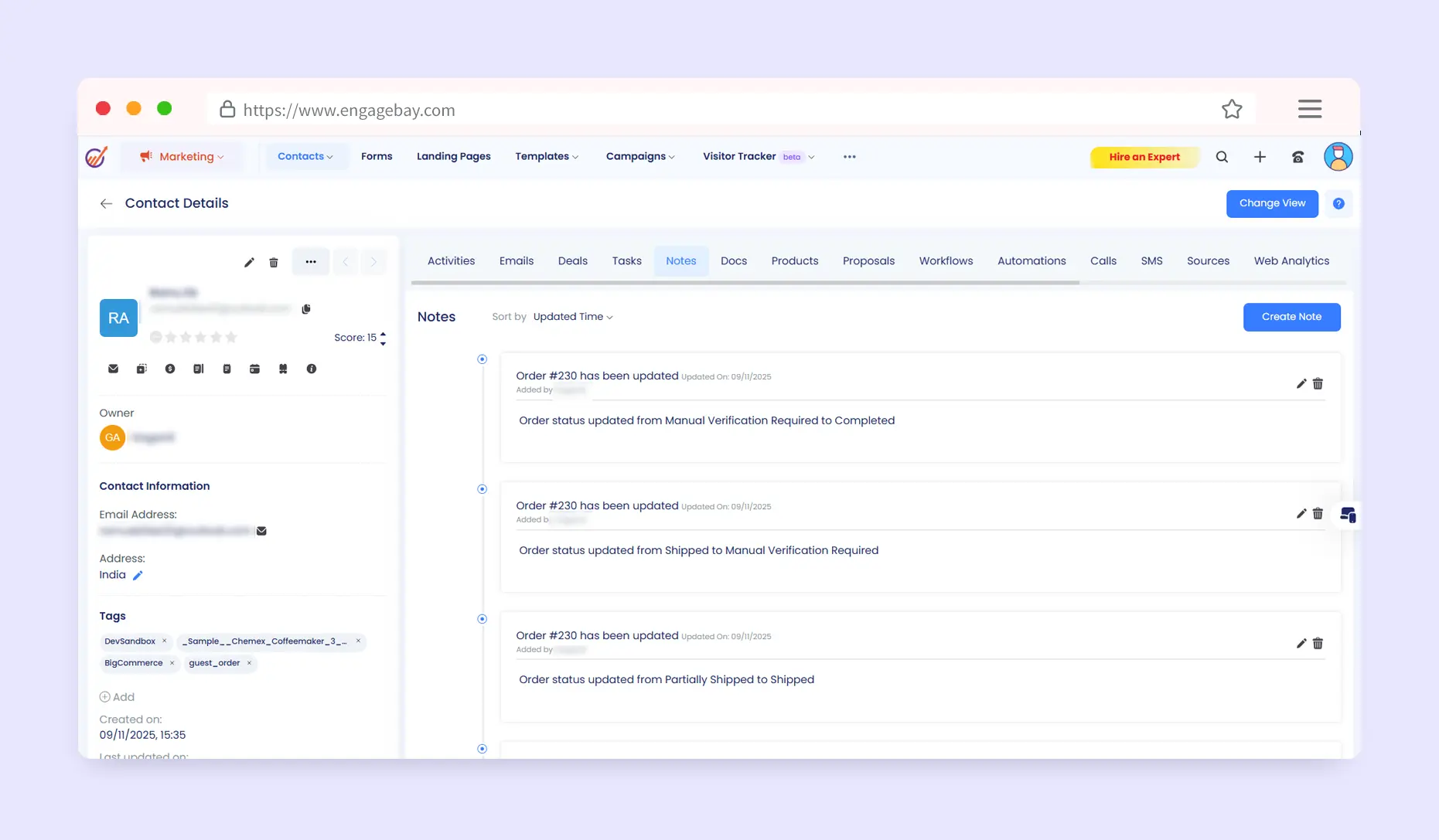 With the EngageBay-BigCommerce integration, track your lead’s activities in EngageBay like products viewed, or categories visited on your website. Use this information to send relevant offers and/or promotions.