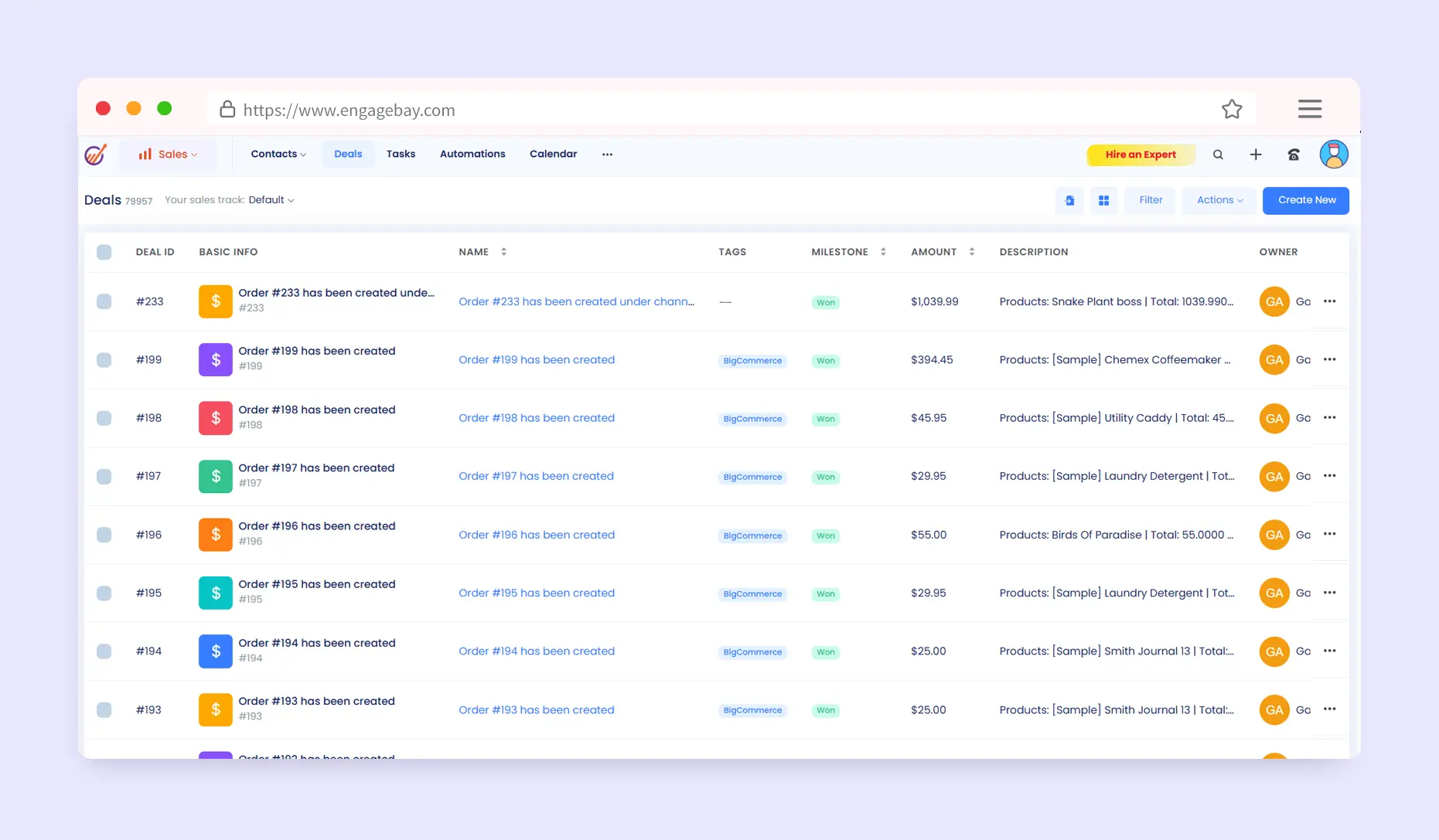 With the EngageBay-BigCommerce integration, you can track a new purchase as a new order activity in EngageBay, and subsequently trigger relevant workflows, whenever an existing customer makes a new purchase.