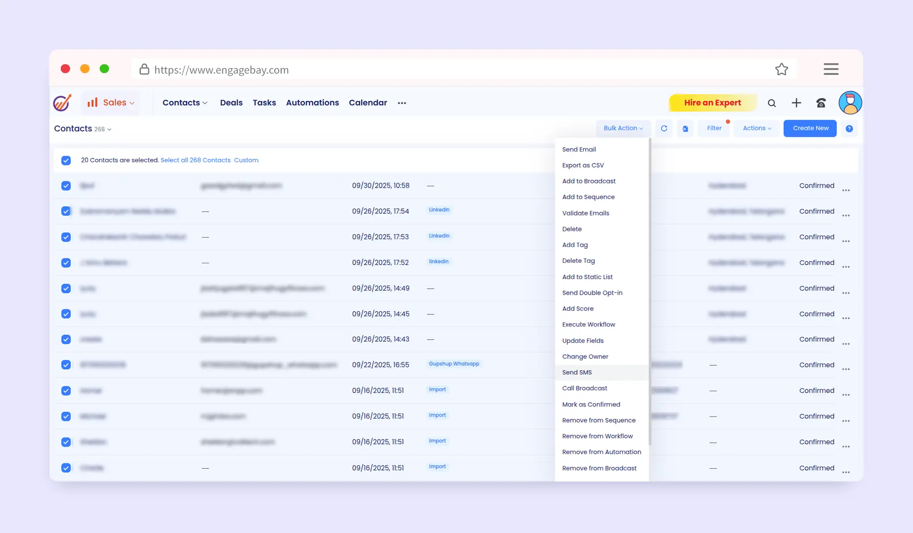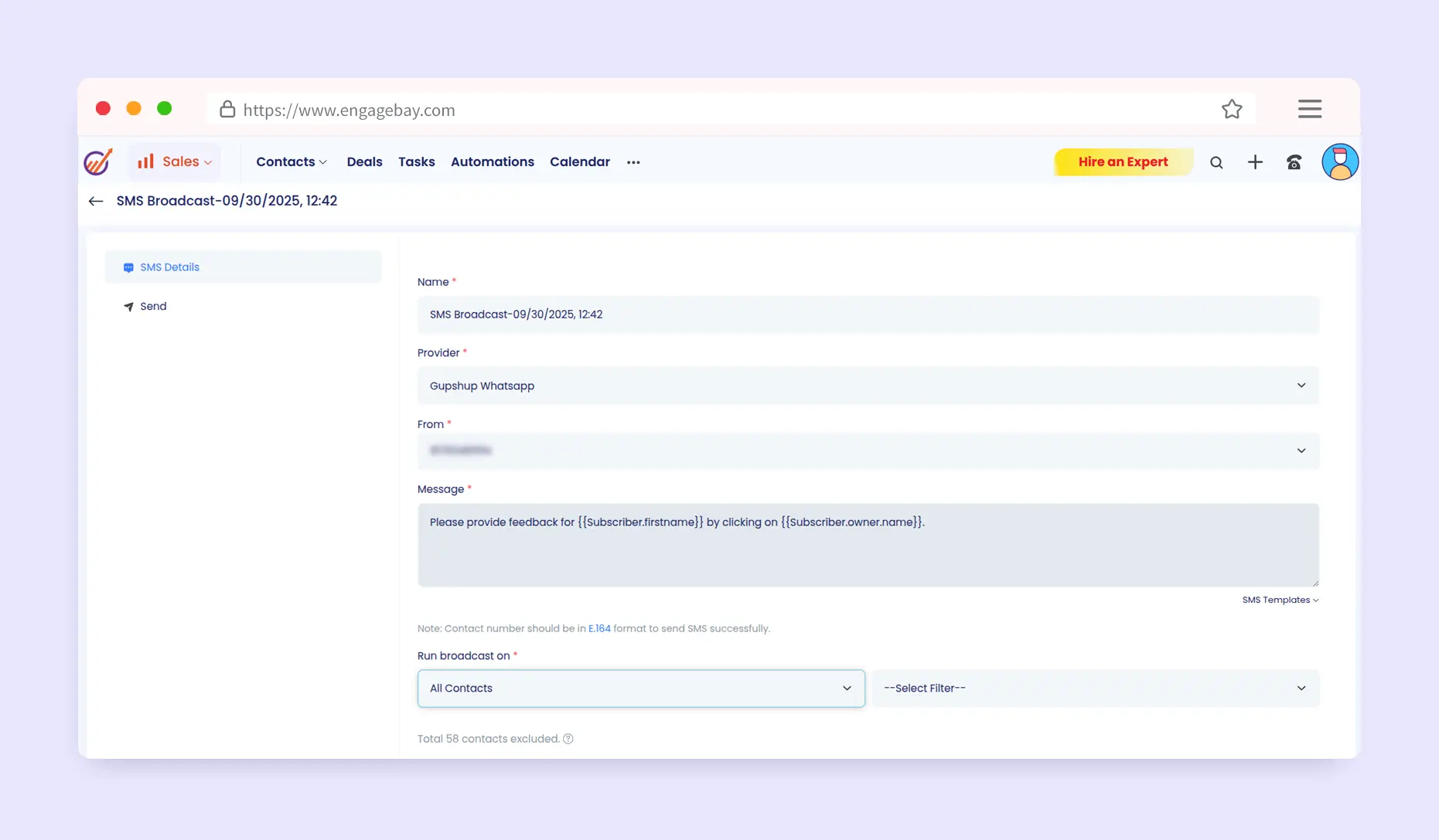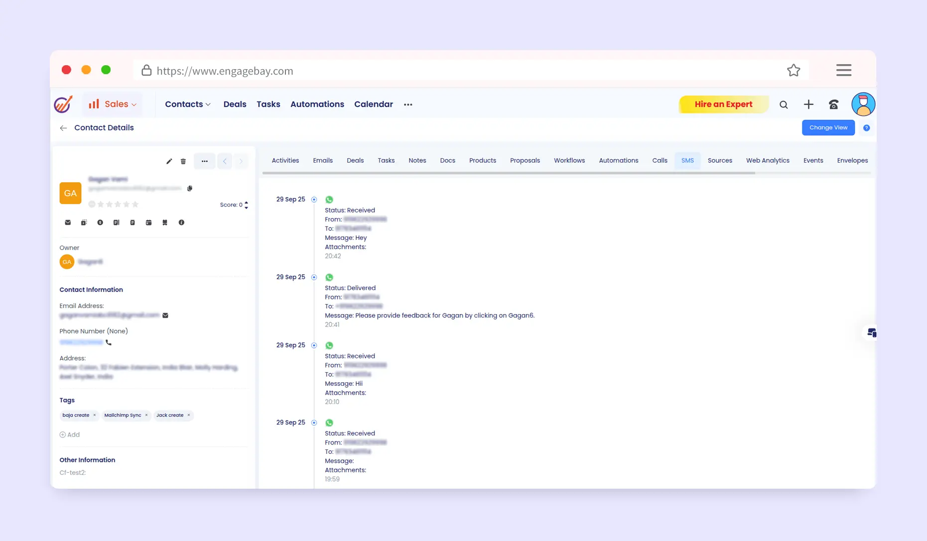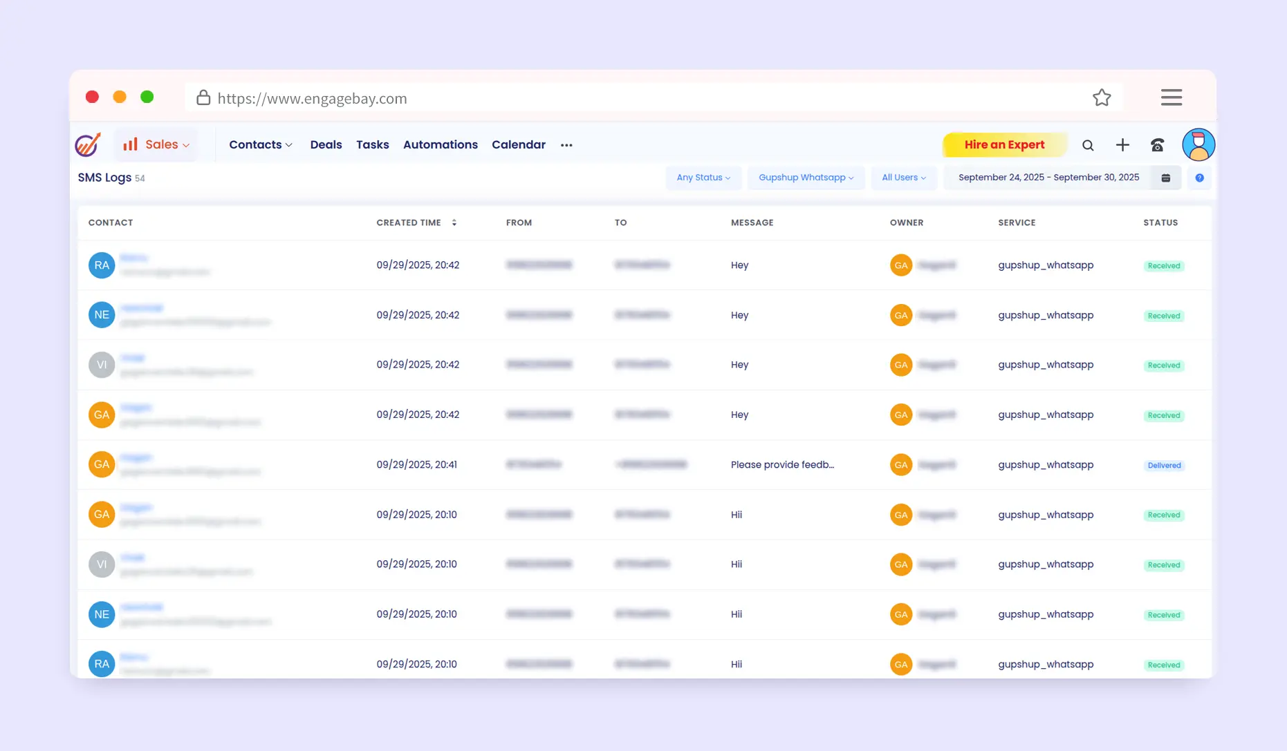 The EngageBay–Gupshup WhatsApp integration powers real-time, two-way messaging directly inside your CRM. Every text—whether a bulk blast, automated campaign, or live customer chat—syncs into EngageBay for complete visibility. Switch from personal replies to mass broadcasts in seconds, without leaving your dashboard.