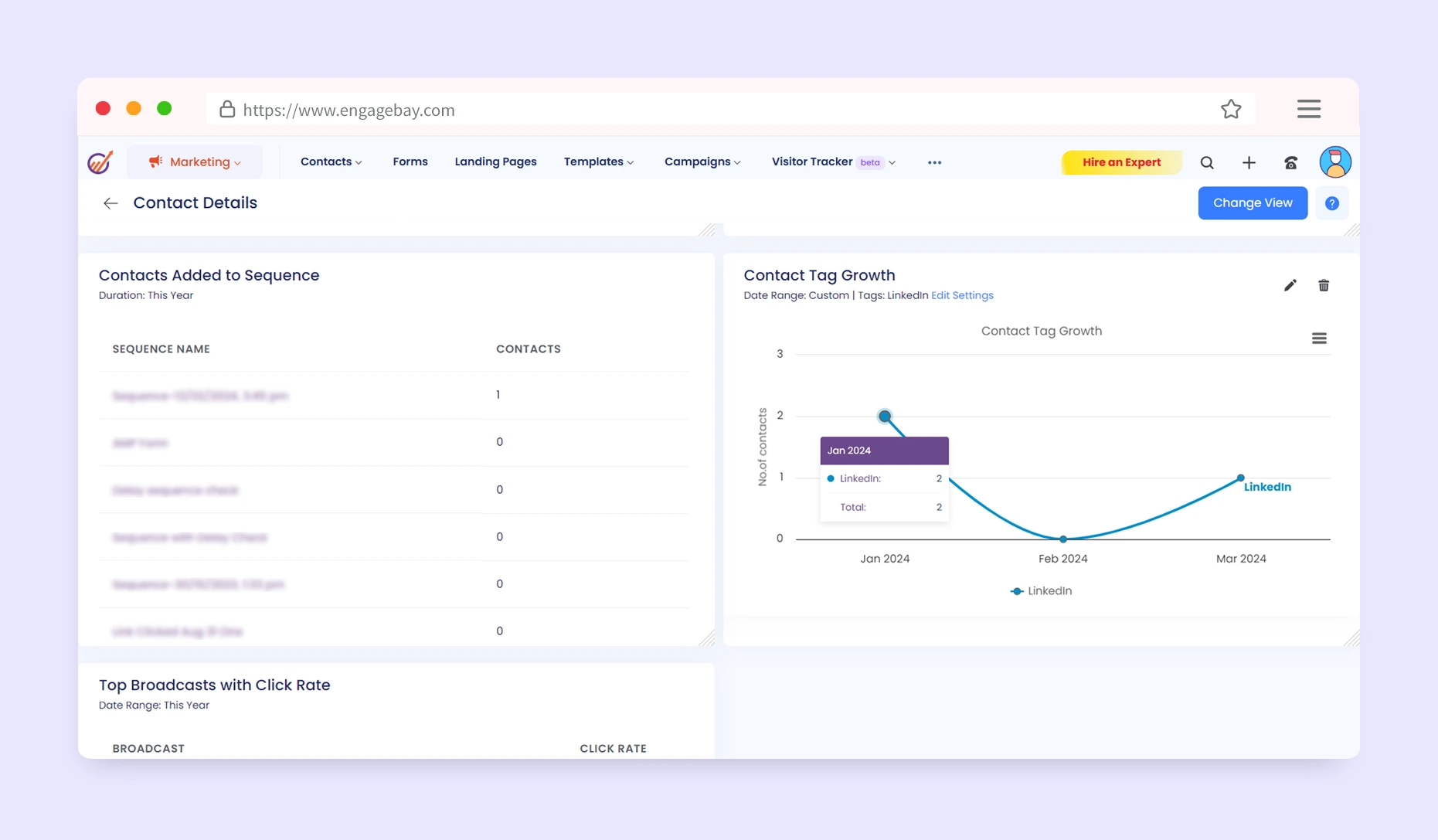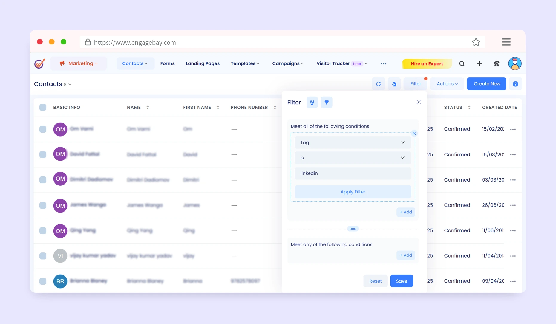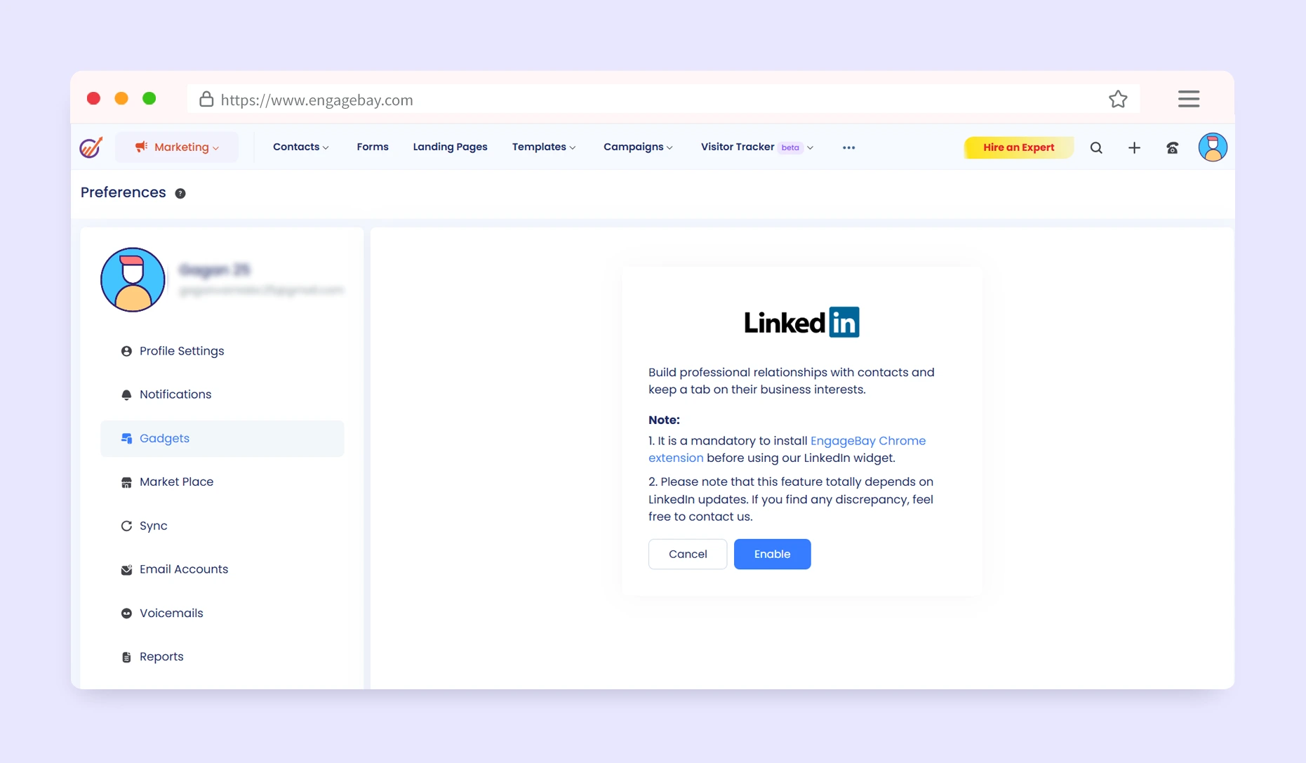 Effortlessly sync your LinkedIn contacts with EngageBay CRM, transforming your network into a potent tool for personalized outreach and boosting sales conversions. This integration enriches your CRM with LinkedIn's vast professional network, enabling targeted communication and relationship-building. Tailor your strategies for enhanced outreach effectiveness, leveraging this seamless connection to foster deeper connections and identify new opportunities, accelerating your sales process.