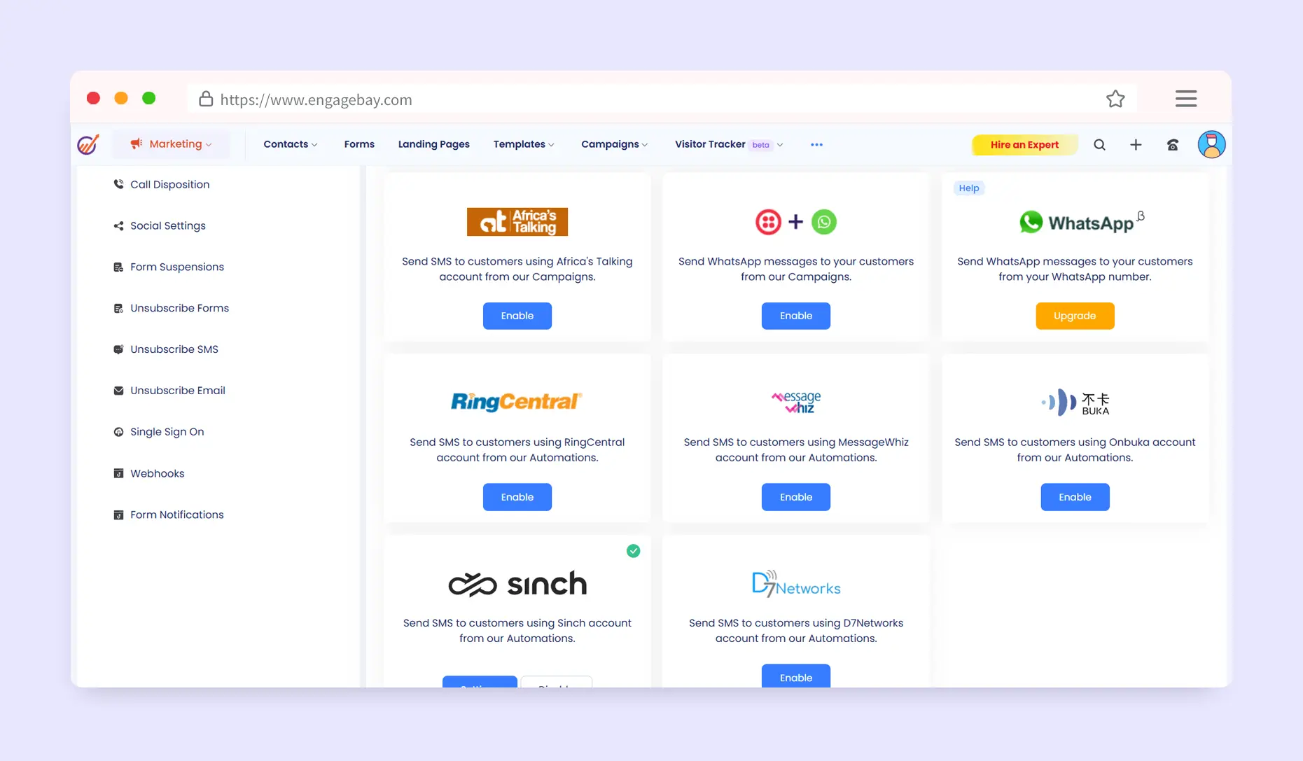 The EngageBay - Sinch integration helps you personalize your message and send them to any of your lists or campaigns, get delivery reports and replies straight into each contact's activities log in EngageBay, keeping you and your team up to date.
