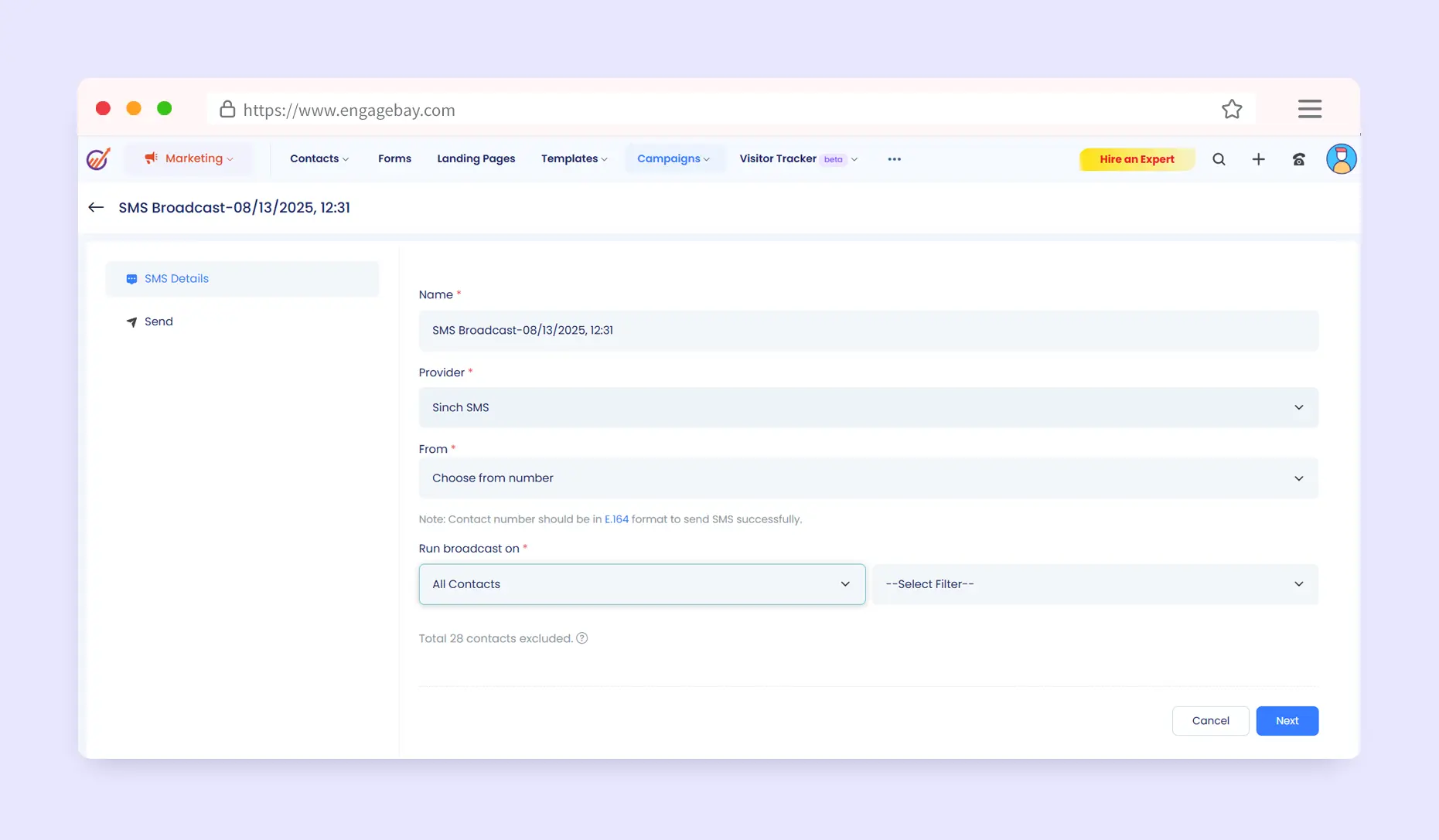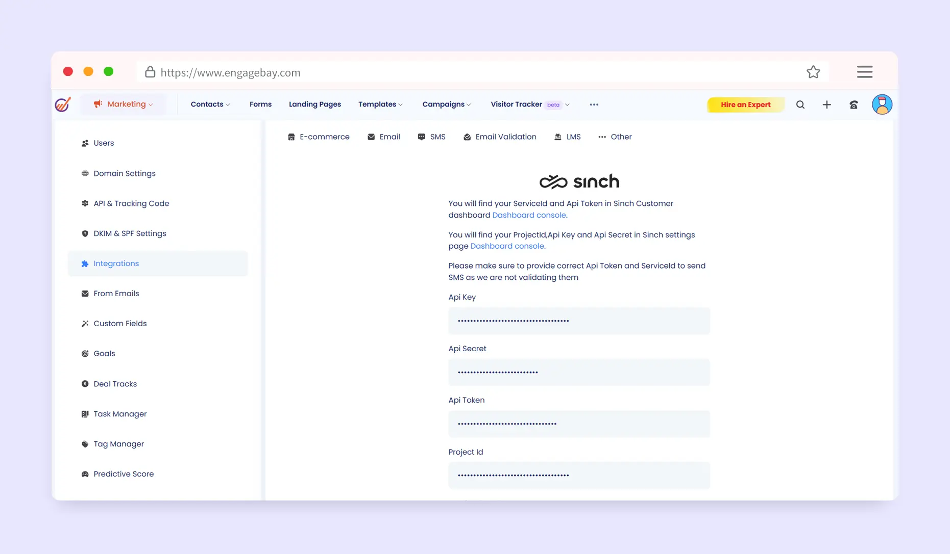 Send and receive messages over SMS using Sinch directly from within your EngageBay platform. Use Sinch as your text service provider and start attending to your customers from EngageBay's unified CRM system, where you can keep track of every communication channel.
