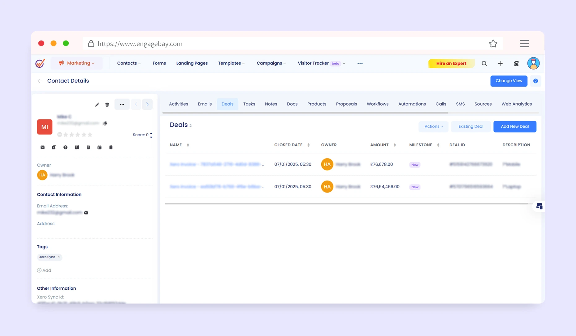 View all of the past invoices of your customers, along with itemized details, pinned to your contact pages with Xero Integration in your EngageBay CRM.